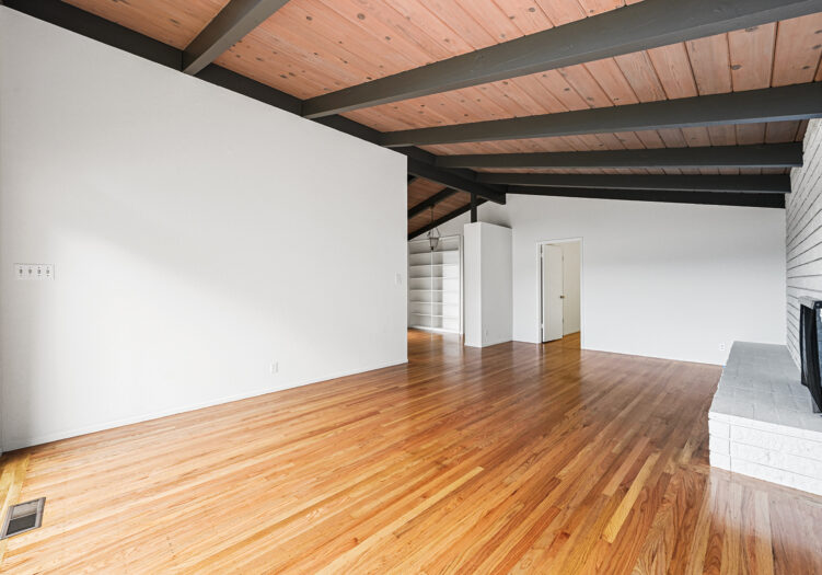 Inside, a spacious living room welcomes you with vaulted beam ceilings and a dramatic floor-to-ceiling wood-burning fireplace with raised hearth. Sliding glass door access leads to a sun-drenched patio, creating seamless indoor-outdoor living.