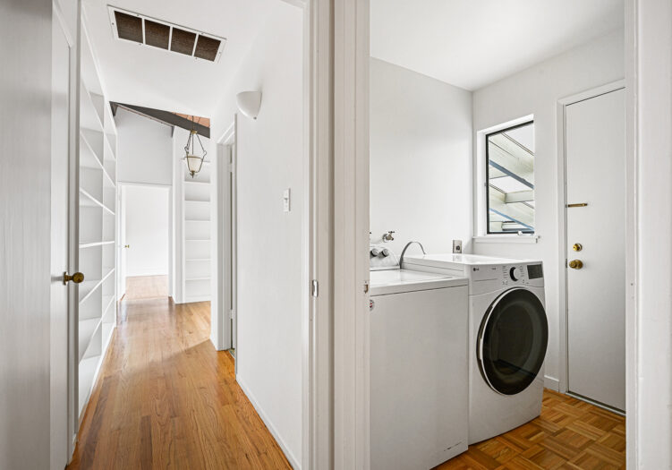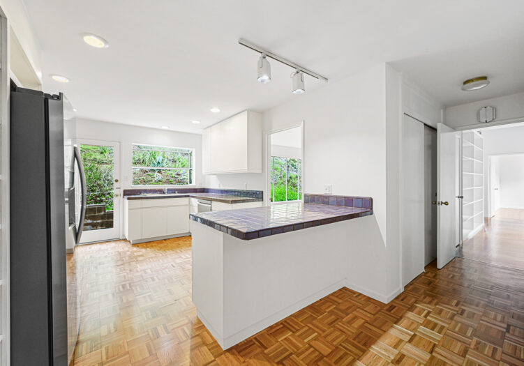 The primary suite features wall-to-wall closets, an updated bathroom, and direct access to a private patio and hillside garden retreat. Three additional bedrooms and a full bath are thoughtfully located down the hall from the kitchen area.