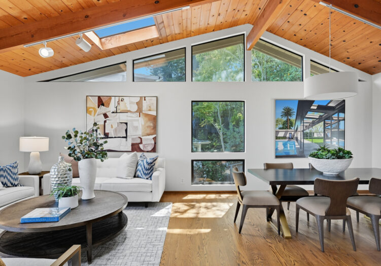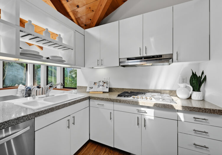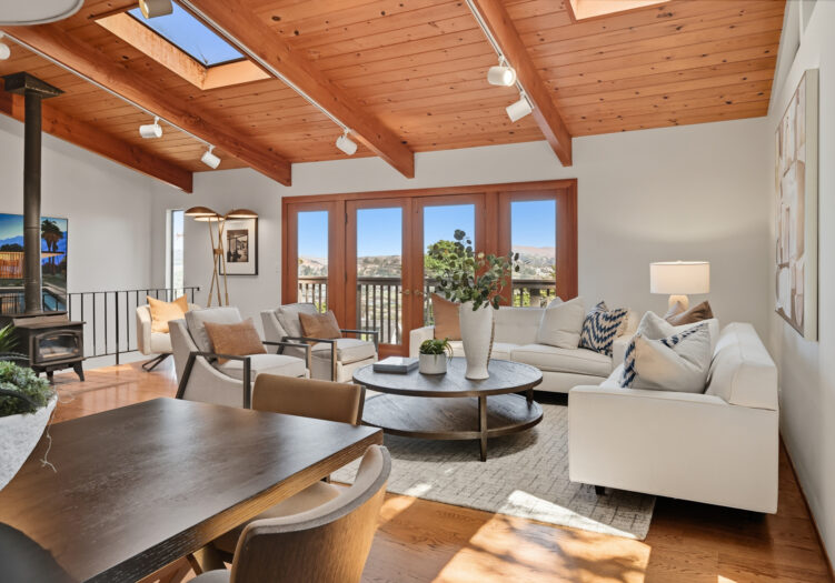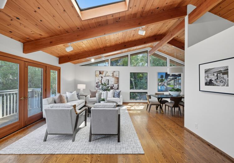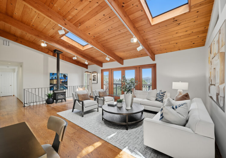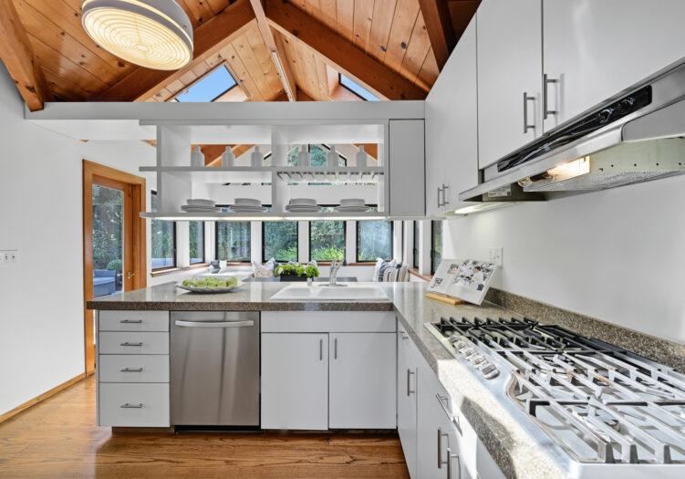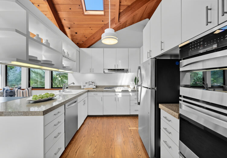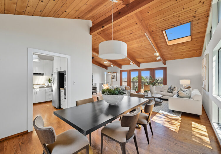 A unique concrete entry and stairway lead to the main living level, making a striking first impression. Arrive on the main level to be greeted by vaulted ceilings and hardwood floors. The spacious living room, anchored by a wood-burning stove, is bathed in abundant natural light from multiple skylights. The room opens to a front deck with expansive views, while its dining area opens to the tranquil back yard. The kitchen is equipped with a gas cooktop, double oven, custom cabinetry with open shelving, and an adjoining breakfast area with built-in seating and direct access to the deck and gardens. Down the hall, the primary suite includes a remodeled bath with double sinks and stall shower. Two additional bedrooms share a full bath, offering flexibility for family, guests, or office use.